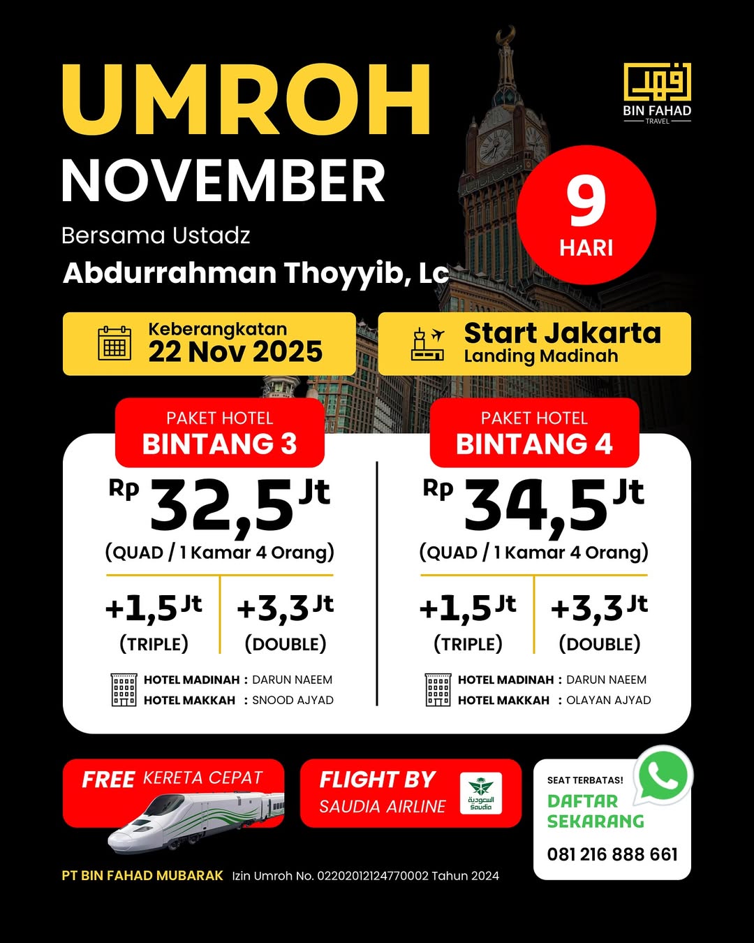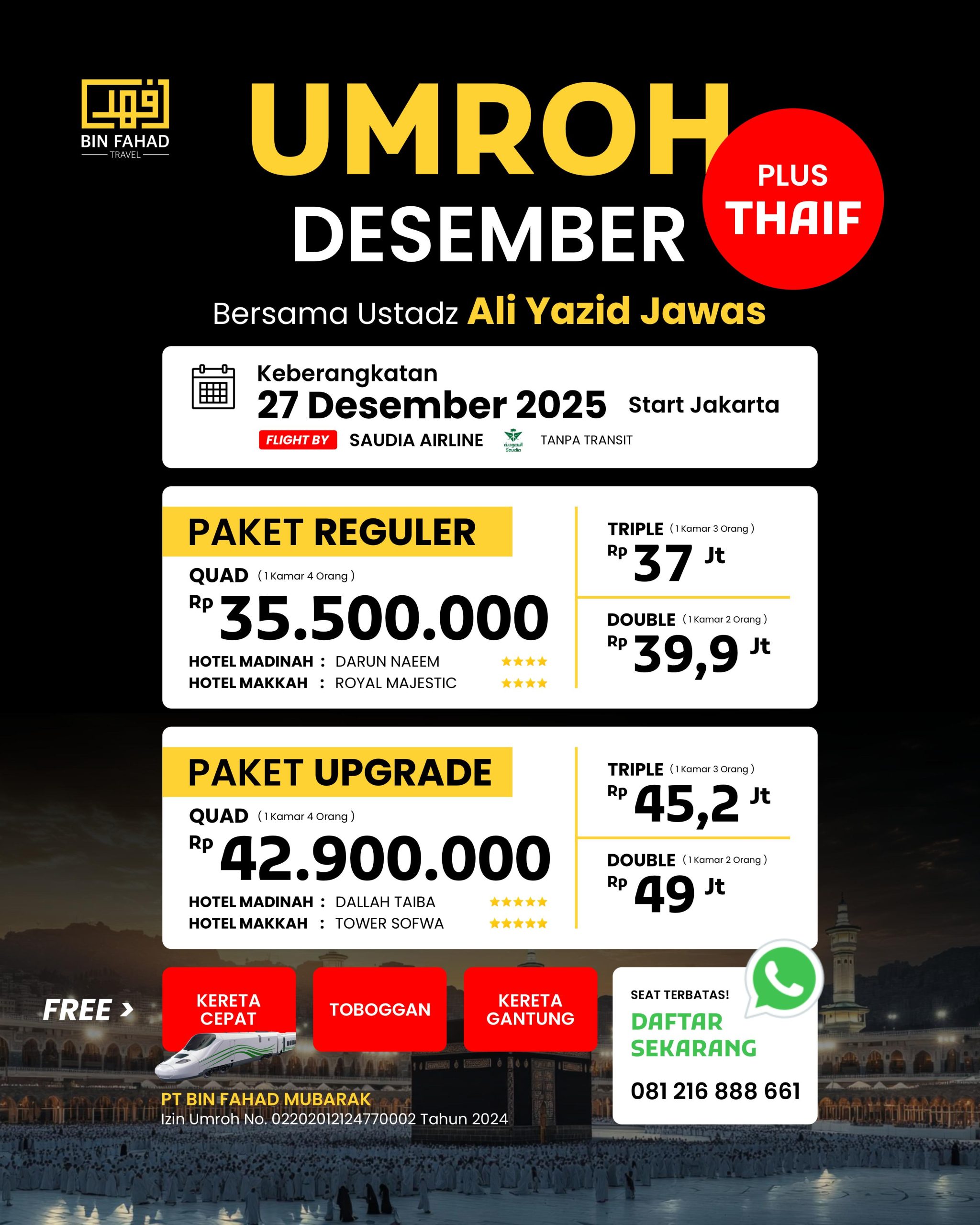 Bin Fahad Travel adalah penyelenggara ibadah umroh berizin resmi dan telah memberangkatkan lebih dari ratusan jamaah sejak berdiri pada 2019. Fokus pada perjalanan umrah, Bin Fahad Travel menawarkan layanan yang disesuaikan dengan kebutuhan Anda.